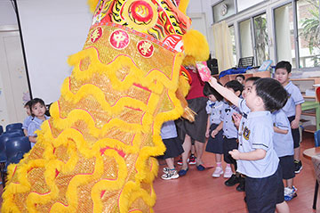 | ▲ 汶中许月兰校长(中)、马海耀副校长(左)及陈美典助理校长(右)一起贺岁。 | ▲ 汶中幼儿园小朋友给“瑞狮”喂红包。 |