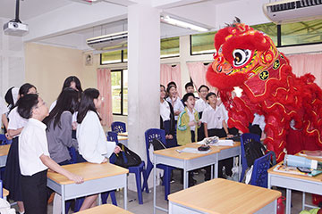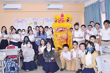 | ▲ “瑞狮”在中学课室表演时摄。 | ▲ 舞狮贺岁表演引得汶中生驻足观看。 |