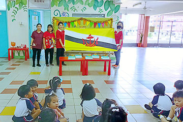 在介绍汶莱国旗、国旗的颜色、国歌之后,幼儿也知道大家唱国歌时要立正、站好等要求。接着便是到了问答的环节,小朋友都能踊跃地回答幼教所提出的问题。最后,大家随着欢快的节拍,唱起了庆祝生日歌,为尊敬的苏丹送出特别的祝福,祝陛下圣体安康,万寿无疆。