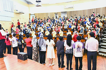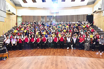 | ▲ 图为汶中小学《弟子规》课程开课仪式合影。 | ▲ 汶莱和谐学会主席林梅英女士(中)在课程中做“表达爱心”的动作示范。 |