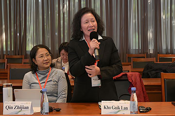 | ▲ 图为汶中许月兰校长(站者)在论坛中发表演讲时摄。 | ▲ 汶中许月兰校长(左2)及奕中张贵娟校长(左)与菲律宾2位与会代表合影。 |